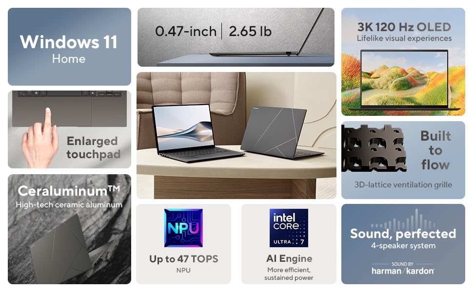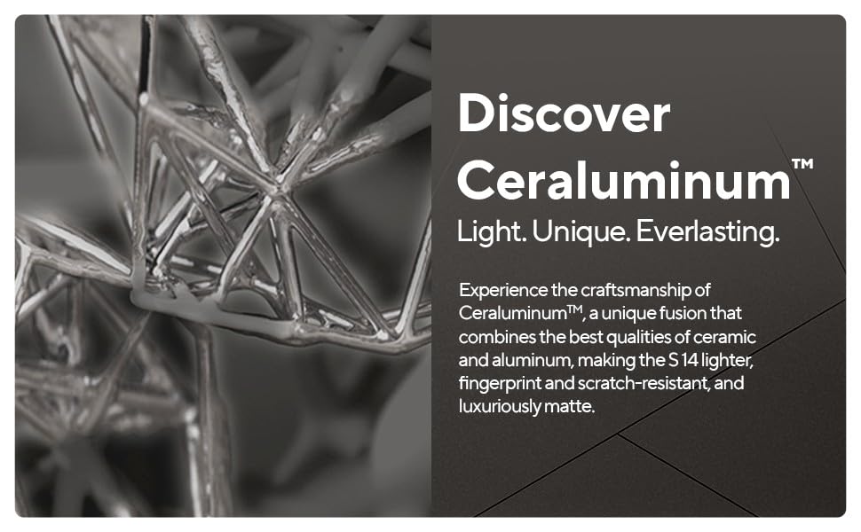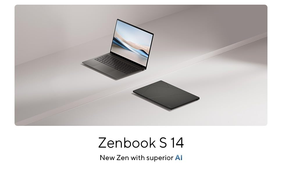 The new Zenbook S 14 harmoniously blends craftsmanship and performance, featuring an impossibly thin 0.47-inch profile made from Ceraluminum. Immerse your senses in a breathtaking 14-inch 3K OLED Lumina touchscreen and experience multi-dimensional, high-fidelity sound from a four speakers. Optimized for productivity, the S 14 is powered by an all-new, supercharged Intel Core Ultra 7 Series 2 processor with an Intel AI Boost NPU up to 47 TOPS that speeds up local AI processes, while a quick-access Copilot AI Assistant key streamlines your workflow. Powerful yet light, keep it portable with an all-day 72Wh battery. Lightweight and sleek, the laptop features a backlit keyboard, 1080p webcam, facial recognition, and Copilot+ PC for intelligent, secure, and immersive computing on the go.